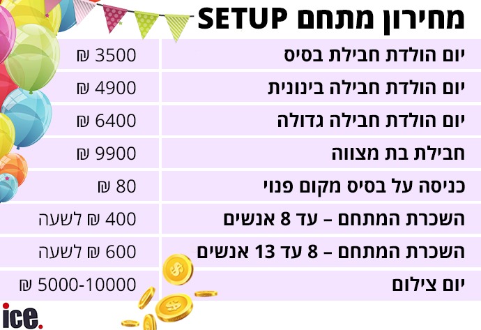 כל החבילות כוללות תחפושות, די ג'יי מפעיל, שתייה, ממתקים וחטיפים ללא הגבלה, בלונים מעוצבים וסגירת המתחם רק בשבילכם. חבילת בסיס היא עד 20 ילדים והשכרת המתחם לשעתיים, בעלות 3500 שקלים. החבילה הבינונית היא עד 30 ילדים והשכרת המתחם לשעתיים, שהיא כוללת גם עוגה מעוצבת וצלם בעלות 4900 שקלים. החבילה הגדולה היא עד 40 ילדים, השכרת המקום לשלוש שעות והיא כוללת גם בר מתוקים, צלם מגנטים ומתנה לחוגג, בעלות 6400 שקלים. ויש גם חבילה לבת מצווש שהיא כוללת הרבה יותר דברים כגון אוכל והסעות בעלות של 9900 שקלים.