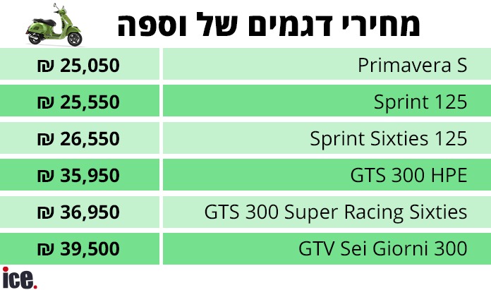 הדגם הזול ביותר הוא Primavera S ועלותו הינה 25,050 שקלים. אחריו נמצא Sprint 125 והוא עולה 500 שקלים יותר. במקום השלישי נמצא Sprint Sixties 125 הנמכר ב26,550 שקלים. את המקום הרביעי תופס GTS 300 HPE שעולה 35,950 שקלים. המקום החמישי שייך לGTS 300 Super Racing Sixties. הדגם האחרון והיקר ביותר במלאי הוא GTV Sei Giorni 300 ועלותו היא 39,500 שקלים.