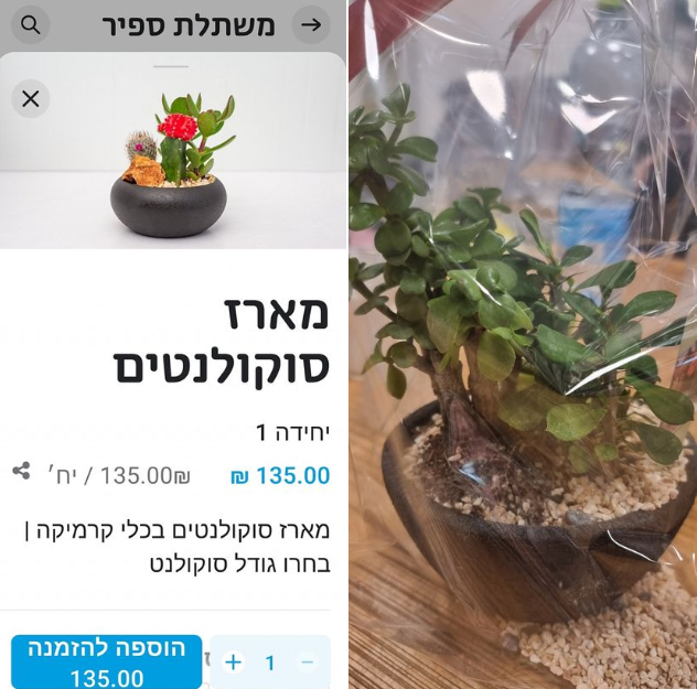 לקוח נוסף מאוכזב והפעם ממשתלת ספיר. הלקוח הזמין מאתר המשתלה מארז סוקולנטים ב-135 שקלים, והתאכזב. הוא שיתף בקבוצה וכתב, "'מארז' ככה זה נראה כשבית העסק מתחבא מאחרי 'התמונה להמחשה בלבד'. וולט עומדים מאחורי בית העסק בטענה שכתוב להמחשה בלבד ואם יש לי בעיה, אז שאקח את העציץ לבית העסק לבקש זיכוי."