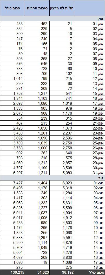 בסך הכל, על פי הטבלה שפורסמה, 96,192 מהם יצאו לחל"ת שלא מרצון. מתחילת המלחמה ה-7/10, סך של 128,601 ביקשו דמי אבטלה מהביטוח הלאומי כאשר 96,139 יצאו לחל"ת שלא מרצון.