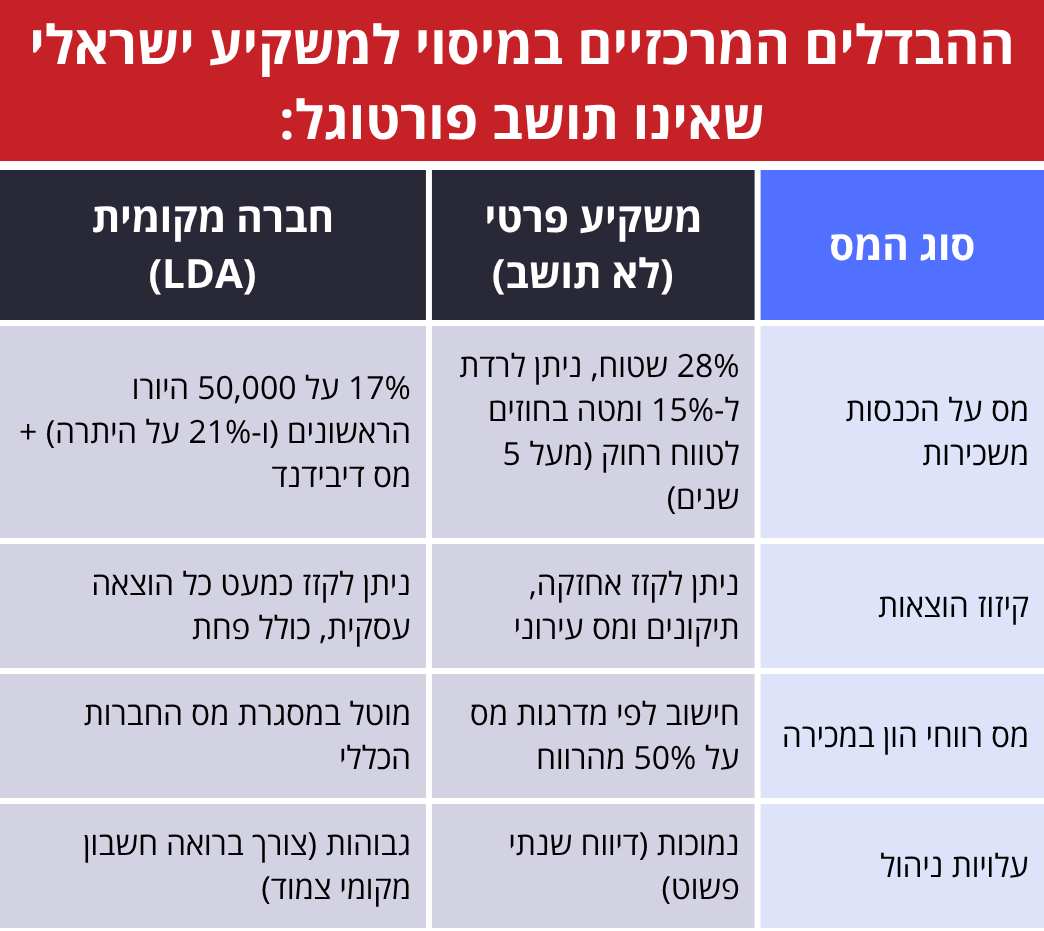 הנה ההבדלים המרכזיים במיסוי למשקיע ישראלי שאינו תושב פורטוגל: