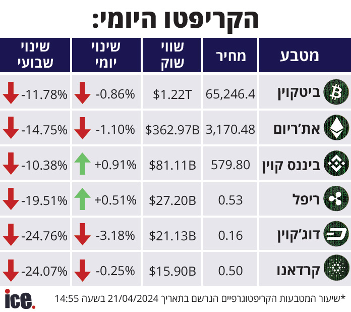 מבין המטבעות ה"חזקים" יותר, הביטקוין נסחר במחיר של 65,246.4 דולר לאחר שירד בשיעור של 0.86%. שווי השוק שלו עומד על 1.22 טריליון דולר. אחר כך, האת'ריום ירד ב-1.10% והוא נסחר ב-3,170.48 דולר. שווי השוק שלו עומד על 362.97 מיליארד דולר. הביננס קוין נסחר ב-579.80 דולר ועלה ב-0.91%. שווי השוק שלו עומד על 81.11 מיליארד דולר.