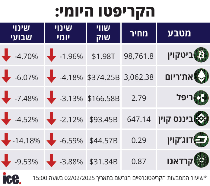 שוק מטבעות הקריפטו ממשיך בירידות הגדולות: הביטקוין שוב יורד ונסחר סביב 98,000 דולר, הדוג'קוין בצניחה חופשית של יותר מ-14% בשבוע החולף. ומה קורה עם האת'ריום והריפל?