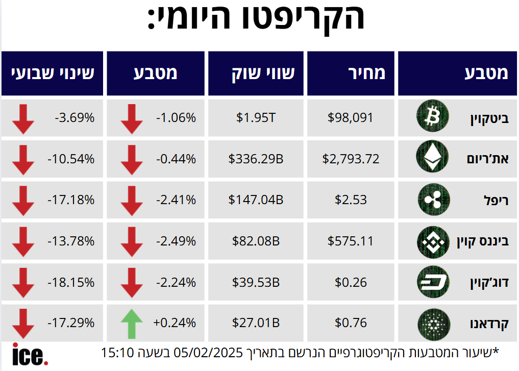 הריפל שרשם אתמול עלייה של 12.12% בערכו מציג שינוי מגמה. המטבע רשם ירידה של 2.41% מה שהשפיע על מחירו שעומד כעת על 2.53 דולר. בשבוע החולף הוא צנח ב-17.18% ובעקבות כך שווי השוק שלו פחת לסכום כולל של 147.04 מיליארד דולר. הביננס קוין, המטבע של בורסת ביננס שנסחר במחיר של 575.11 דולר ירד היום ב-2.49%. בשבוע החולף הוא רשם ירידה שבועית של 13.78% מה השפיע על שווי השוק שלו שעומד כעת על 82.08 מיליארד דולר.