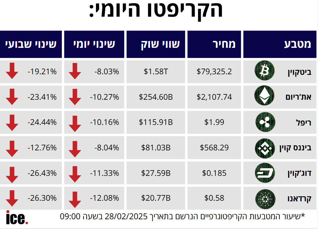 השוק ממשיך לרדת: המסחר בשוק הקריפטו התאפיין במגמה שלילית והציג ירידות שערים מטאוריות. האת'ריום נופל ביותר מ-10%, הריפל מתרסק והביטקוין ממשיך לאבד גובה כשמחירו יורד למתחת ל-80,000 דולר | הקריפטו היומי