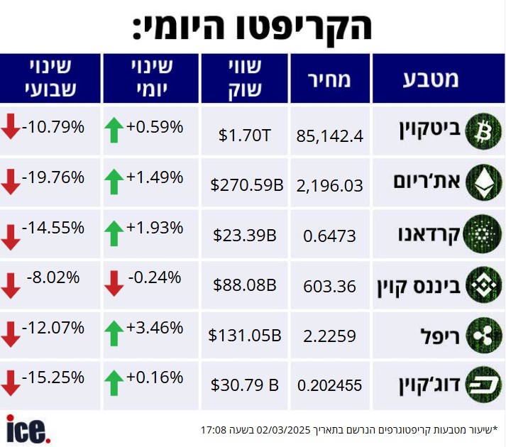 שוק מטבעות הקריפטו חווה היום (ראשון) מגמה חיובית בעיקרה, זאת מלבד מטבע הביננס קוין אשר פחת ב-0.24%. במקום הראשון ניצב מטבע הביטקוין אשר עלה ב-0.59%, שווי השוק שלו עומד על 1.70 טריליון דולר והוא נסחר במחיר של 85,142.4 דולר. במהלך השבוע האחרון, המטבע צנח ב-10.79%.