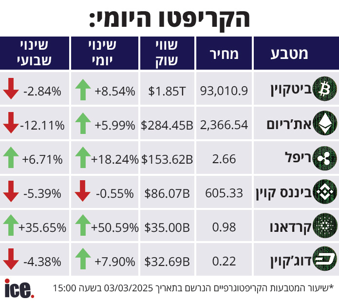 שוק מטבעות הקריפטו חווה היום (שני) מגמה חיובית בעיקרה כהמשך לאתמול. מטבע הביטקוין עלה בשינוי יומי של 8.54% ושבועי של 2.84% לפי שווי של 1.85 טריליון דולר והוא נסחר בשווי של 93,010 דולר.