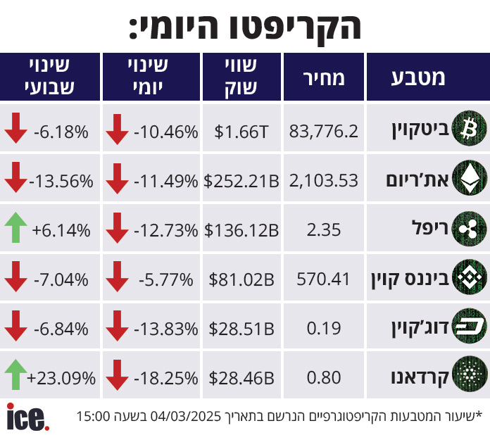 שוק מטבעות הקריפטו חווה היום (שלישי) מגמה שלילית, זאת לאחר שששת המטבעות הדיגיטליים הבולטים רשמו אמש שינויים חיוביים. נכון להיום, הביטקוין, המטבע הדיגיטלי הפופולרי ביותר בשוק הקריפטו, צנח ב-10.46%, שווי השוק שלו מסתכם ב-1.66 טריליון דולר והוא נסחר במחיר של 83,776.2 דולר.