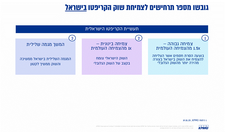 מחקר חדש של חברת KPMG הציג תחזית לתרומה הכלכלית הפוטנציאלית שעשויה להיות לפיתוח תעשיית הקריפטו המקומית; המחקר משרטט תרחישי צמיחה שונים לענף בהתחשב במודלים רגולטורים קיימים ובוחן את השפעתם על המשק והכלכלה הישראלית; המחקר הוצג במסגרת המפגש השני של הוועדה לגיבוש חזון ואסטרטגיה לאומית לתחום הקריפטו, בלוקצ'יין וה Web3 בראשות אריק פינטו, מנכ"ל בנק הפועלים לשעבר