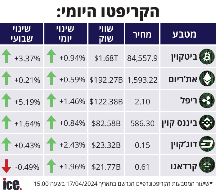 שוק מטבעות הקריפטו רושם היום (חמישי) נכון לשעה 15:00 עליות מתונות יומיות בכל המטבעות המרכזיים. כך, מטבע הביטקוין עלה ברמה של 0.94% ובעליה שבועית של 3.37%. הביטקוין נסחר לפי שווי של 1.68 טריליון דולר ובשווי של 84,557.9 דולר. מטבע הביננס קוין עלה בשיעור של 0.84%, לפי שווי שוק של 82.58 מיליארד דולר. המטבע חווה עליה שבועית של 1.64% והוא נסחר בשווי של 586.3 דולר.