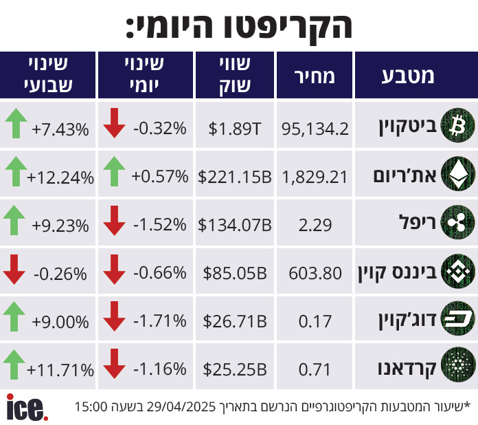 שוק מטבעות הקריפטו הציג מגמת ירידה בעיקרה, זאת מלבד האת'ריום שעלה ב-0.57%. הביטקוין אכזב את המשקיעים וירד ב-0.32%, שווי השוק שלו מסתכם ב-1.89 טריליון דולר והוא נסחר במחיר של 95,134.2 דולר