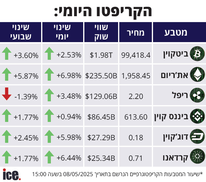 שוק מטבעות הקריפטו רושם היום (חמישי) נכון לשעה 15:00 מגמה חיובית בקרב המטבעות המרכזיים. כך, מטבע הביטקוין עלה ברמה של 2.53% ובעליה שבועית של 3.6%. הביטקוין נסחר לפי שווי של 1.98 טריליון דולר ובשווי של 99,418.4 דולר.