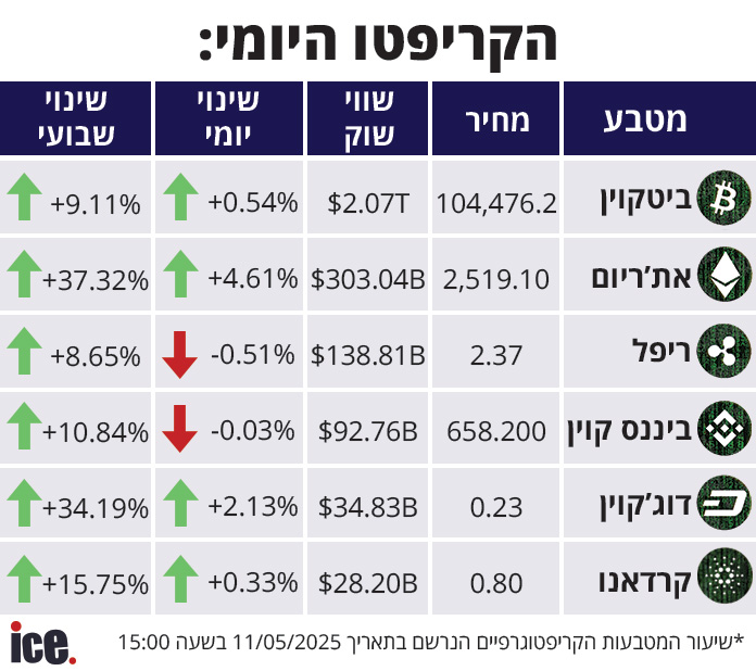 שוק הקריפטו התאפיין במגמה חיובית, זאת מלבד שני מטבעות דיגיטליים שהציגו שינוי שלילי - הריפל והביננס קוין. הביטקוין עלה ב-0.54%, שווי השוק שלו הסתכם ב-2.07 טריליון דולר והוא נסחר במחיר של 104,476.2 דולר