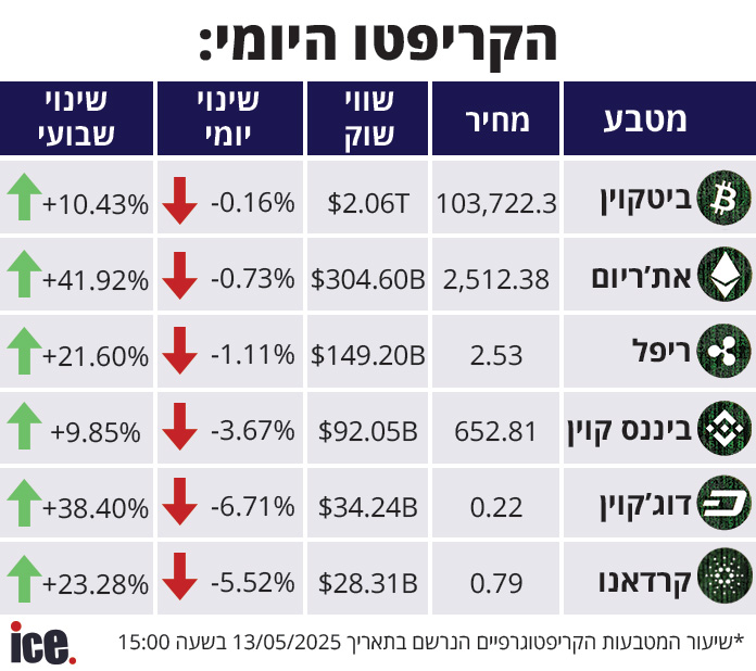 לאחר שבוע ירוק במיוחד, שוק המטבעות הקריפטוגרפיים חווה מגמה שלילית. מטבע הביטקוין מדרדר ב-0.16%, שווי השוק שלו עומד על 2.06 טריליון דולר והוא נסחר במחיר של 103,722 דולר ליחידה