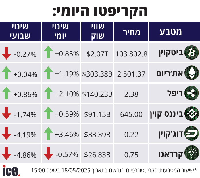 שוק מטבעות הקריפטו רושם היום (ראשון) מגמה חיובית ברובה, כאשר מטבע הקריפטו הפופולרי, הביטקוין רושם עלייה בשיעור של 0.85%, שווי השוק שלו מסתכם ב-2.07 טריליון דולר והוא נסחר ב-103,802.8 דולר.