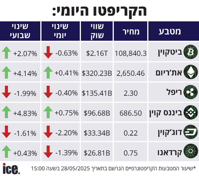 שוק מטבעות הקריפטו רושם היום (רביעי) נכון לשעה 15:00 מגמה מעורבת בקרב כל המטבעות המרכזיים. כך, מטבע הביטקוין ירד ברמה של 0.63% ובעליה שבועית של 2.07%. הביטקוין נסחר לפי שווי של 2.16 טריליון דולר ובשווי של 108,840 דולר.