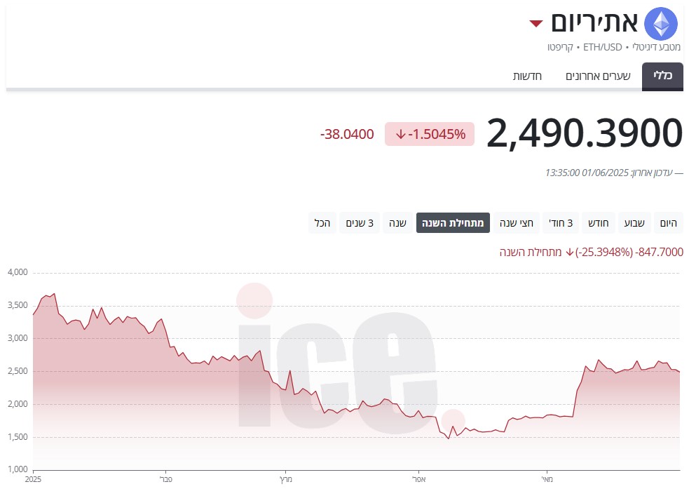 לעומתו, את'ריום (ETH), שנסחר ב-2,488 דולר, רשם ירידה יומית של 1.57%, אך המשמעותית יותר היא הירידה של 25.45% מאז תחילת השנה – מה שמעורר סימני שאלה בקרב המשקיעים שראו בו פלטפורמת העתיד לחוזים חכמים ודיפיי.