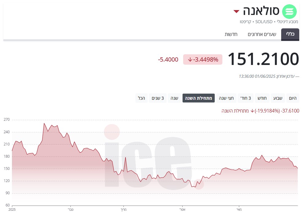 סולאנה (SOL) סובל גם הוא מירידה חדה – המחיר הנוכחי עומד על 151.6 דולר, עם ירידה יומית של 3.34% וצניחה של 19.91% מתחילת שנה. לאחר שנה שבה רשם עליות חדות ובנה לעצמו תדמית של מתחרה טכנולוגי מהיר וזול, הירידות האחרונות מאותתות על קושי לשמר מומנטום.