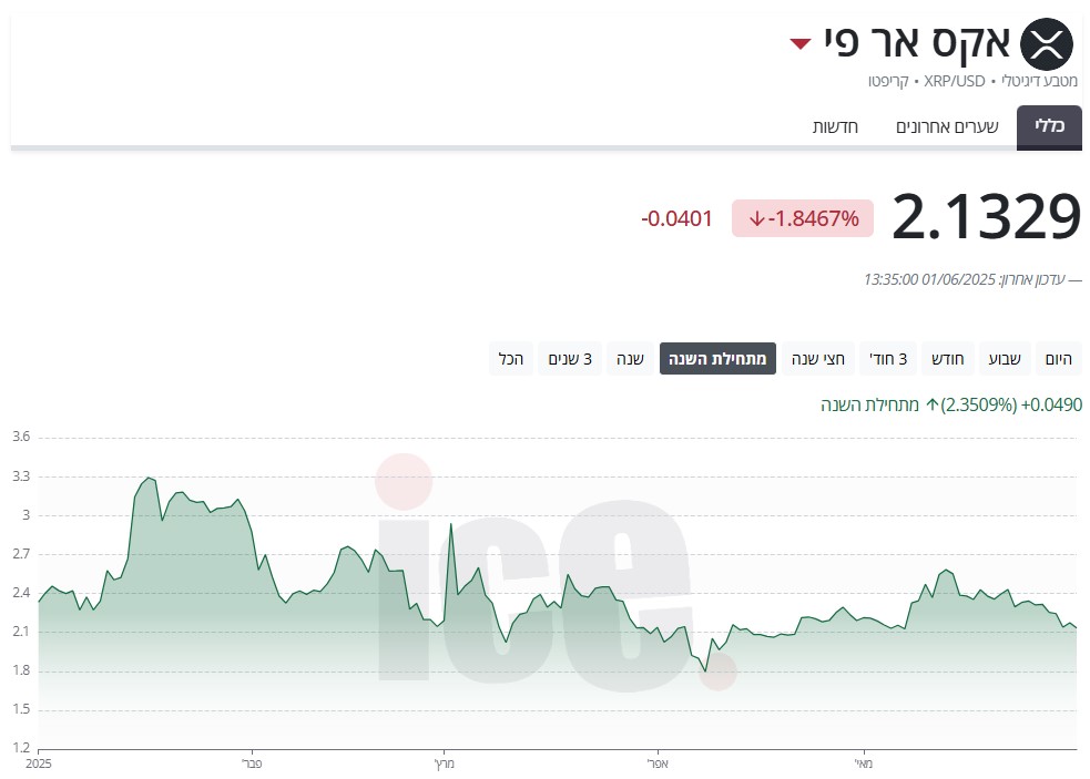 גם XRP, שמזוהה עם העברות כספים גלובליות דרך רשת RippleNet, מציג ירידה יומית של 1.91% למחיר של 2.13 דולר, כשהמגמה הכללית שלו בחודשים האחרונים לא מעודדת, במיוחד לאור המשך חוסר הוודאות הרגולטורית בתחום.