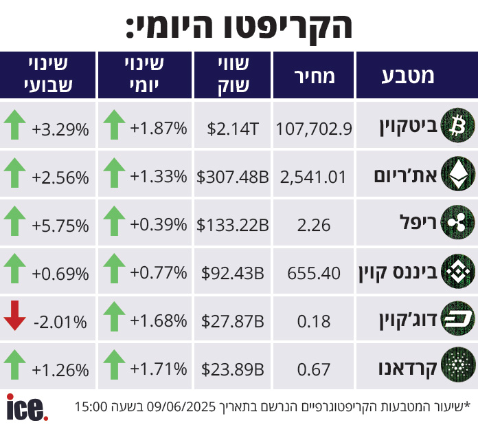 את רשימת המטבעות הגדולים מוביל כמובן הביטקוין שעלה בשיעור של 1.87% לרמה של 107,702 דולר ליחידה ושומר על שווי שוק גבוה של 2.14 טריליון דולר. המטבע השני בגודלו האתריום רושם עלייה בשיעור של 1.33% לרמה של 2,541 דולר ליחידה ועומד על שווי שוק של 307.48 מיליארד דולר. המטבע השלישי בגודלו הריפל עלה בשיעור של 0.39% לרמה של 2.26 דולר ליחידה ונסחר בשווי שוק של 92.43 מיליארד דולר.