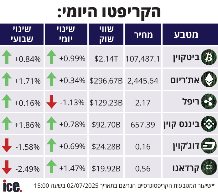 בקרב המטבע הגדול ביותר- הביטקוין נרשמה עלייה של 0.99% לרמה של 107,487 דולר ליחידה. שווי השוק עומד על 2.14 טריליון דולר. המטבע השני בגודלו האתריום רשם עלייה בשיעור של 0.34% לרמה של 2,445.67 דולר ליחידה ועומד על שווי שוק של 296.67 מיליארד דולר. המטבע השלישי בגודלו הריפל, כאמור רשם ירידה בשיעור של 1.13% לרמה של 2.17 דולר ליחידה ועומד על שווי שוק 129.23 מיליארד דולר.