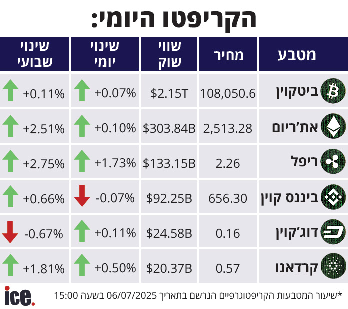 שוק מטבעות הקריפטו רשם היום (ראשון) מגמה חיובית ברוב המטבעות הפופולריים. הביטקוין עלה בשיעור של 0.07%, שווי השוק שלו עומד על 2.15 טריליון דולר הוא נסחר ב-108,050.6 דולר.