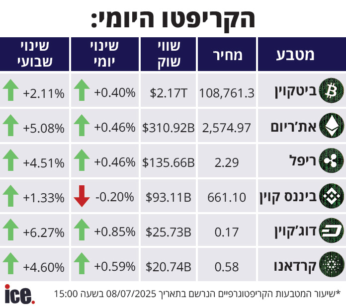 שוק מטבעות הקריפטו חווה מגמה חיובית, זאת כאשר הביטקוין גדל ב-0.40%, שווי השוק שלו מסתכם ב-2.17 טריליון דולר והוא נסחר במחיר של 108,761.3 דולר. זה המטבע היחיד שהציג שינוי שלילי וירד ב-0.20%