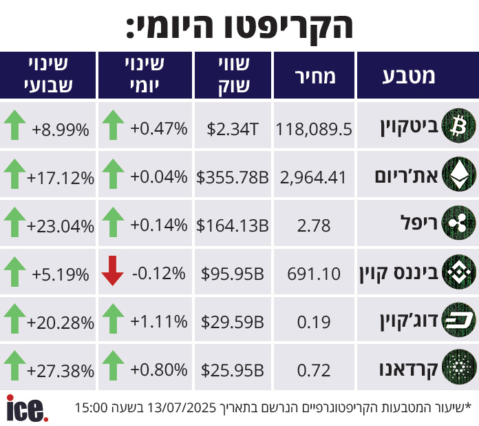 שוק מטבעות הקריפטו רשם היום (ראשון) מגמה חיובית ברוב המטבעות הפופולריים. הביטקוין רשם עלייה בשיעור של 0.47%, שווי השוק שלו מסתכם ב-2.34 טריליון דולר והוא נסחר בסך של 118,089.5 דולר.