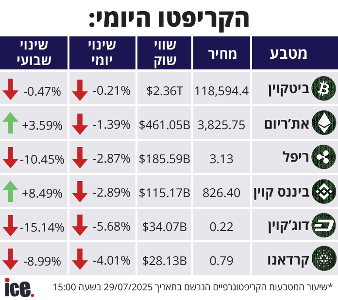 שוק מטבעות הקריפטו הציג מגמה שלילית: הביטקוין ירד ב-0.21%, שווי השוק שלו עומד על 2.36 טריליון דולר והוא נסחר במחיר של 118,594.4 דולר. זה המטבע שצנח ב-5.68%