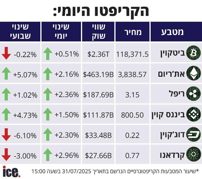 כל המטבעות המובילים בשוק חוזרים לרשום עליות חיוביות ביממה האחרונה. המטבע המוביל את הרשימה, הביטקוין רשם עלייה זעירה בשיעור של 0.51%, הריפל רושם עלייה בשיעור של 2.36% ונסחר כעת בשווי של 3.15 דולר