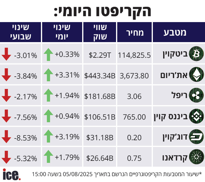 שוק הקריפטו חווה מגמה חיובית: המטבע שהציג את השינוי החיובי הגבוה ביותר הוא האת'ריום שצמח ב-3.31%. הביטקוין עלה ב-0.33%, הוא נסחר במחיר של 114,825.5 דולר ושווי השוק שלו מסתכם ב-2.29 טריליון דולר | כל הפרטים
