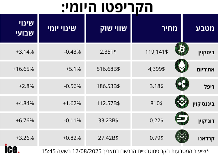 שוק מטבעות הקריפטו רושם היום (שלישי) נכון לשעה 15:45 מגמה מעורבת בקרב המטבעות המרכזיים. כך, מטבע הביטקוין ירד ברמה של 0.43% ובעליה שבועית של 3.14%. הביטקוין נסחר לפי שווי של 2.35 טריליון דולר ובשווי של 119,141 דולר.
