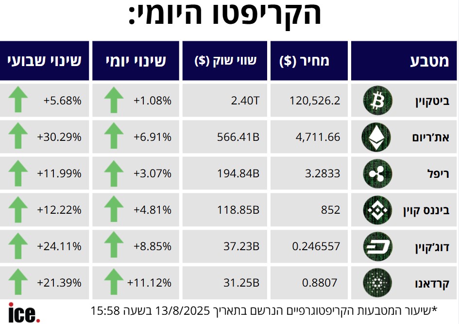 שוק מטבעות הקריפטו הציג מגמה חיובית, זאת כאשר הביטקוין גדל ב-1.08%, שווי השוק שלו מסתכם ב-2.40 טריליון דולר והוא נסחר במחיר של 120,526.2 דולר. המטבע שהציג את השינוי החיובי הגבוה ביותר הוא הקרדאנו