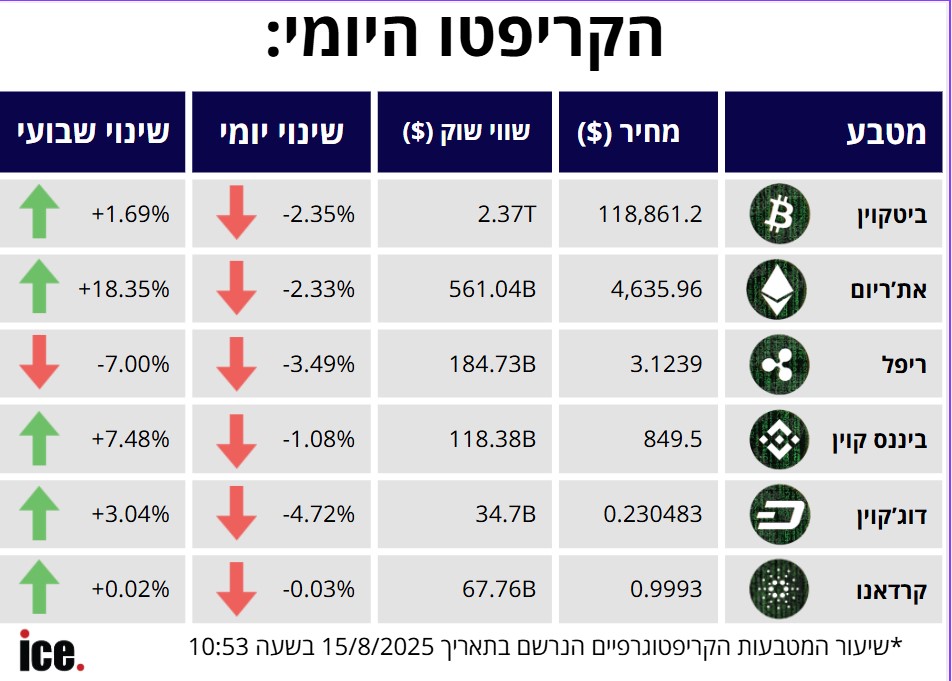 הביטקוין שעלה לשיא של כול הזמנים, ירד ב־2.35% למחיר של כ־118.861 דולר ושווי השוק שלו עומד על 2.37 טריליון דולר.