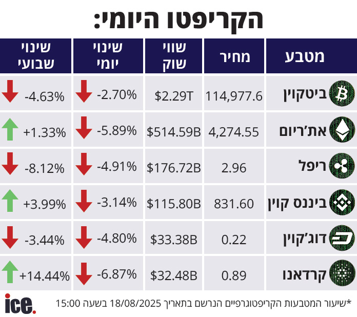 ירידות בכלל המטבעות המובילים. ביטקוין צונח מתחת ל-115,000 דולר ומגיע לשפל של 11 ימים. האת'ריום מתרסק אך עדיין נשאר ירוק בהסתכלות שבועית