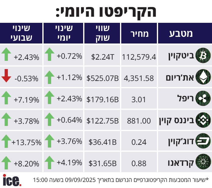 שוק הקריפטו חווה מגמה חיובית, זאת כאשר הביטקוין גדל ב-0.72%, שווי השוק שלו מסתכם ב-2.24 טריליון דולר והוא נסחר במחיר של 112,579.4 דולר. זה המטבע שזינק ב-4.19%