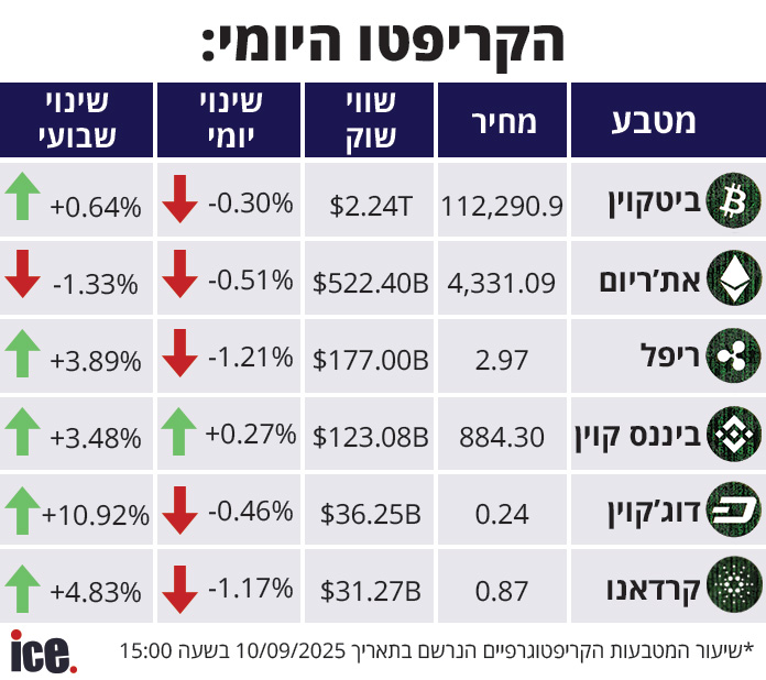 לאחר שאמש (שלישי) נרשמה מגמה חיובית, שוק מטבעות הקריפטו מציג היום (רביעי) מגמה שלילית, זאת מלבד מטבע הביננס קוין שגדל ב-0.27%. מטבע הביטקוין ירד ב-0.30%, שווי השוק שלו עומד על 2.24 טריליון דולר והוא נסחר במחיר של 112,290.9 דולר. במהלך השבוע, המטבע עלה ב-0.64%.