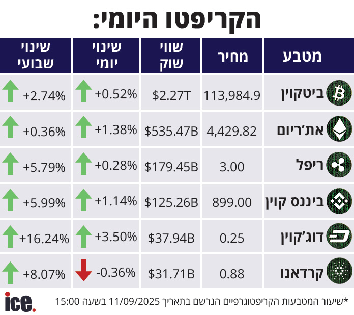 שוק מטבעות הקריפטו הציג מגמה חיובית, זאת מלבד מטבע הקרדאנו שהציג שינוי שלילי ופחת ב-0.36%. הביטקוין עלה ב-0.52%, שווי השוק שלו עומד על 2.27 טריליון דולר והוא נסחר במחיר של 113,984.9 דולר
