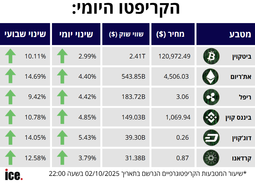 בזמן יום כיפור המטבעות הדיגיטליים טסו למעלה כאשר ביטקוין עלה בכ-3%. הוא נסחר כעת במחיר 120,972 דולר ומוערך ב-2.41 טריליון דולר