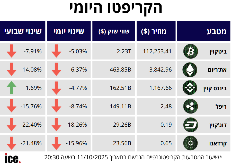 היום (שבת) בהמשך ליום המסחר הגרוע ביותר מאז אפריל בשוקי המניות, גם המטבעות הדיגיטליים נפגעים. מגמה שלילית חדה בשוק, כאשר ביטקוין יורד ב-5.03% למחיר 112,253 דולר.