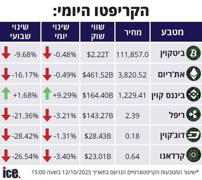 ביטקוין, המטבע הגדול ביותר, ירד ב-0.48% במהלך היום ל-111,857 דולר, ובשבוע האחרון צנח ב-9.68%, כאשר שווי השוק שלו עומד על 2.22 טריליון דולר.