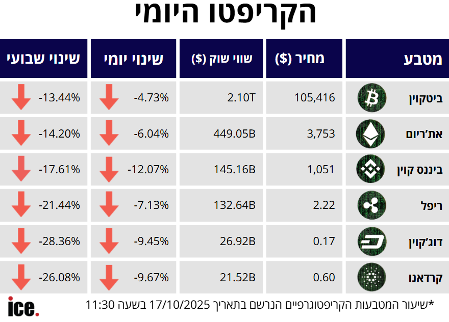 היום (שישי), שוק הקריפטו בקריסה כללית כאשר כלל המטבעות המובילים צונחים בחדות. ביטקוין יורד ב-4.73% למחיר 105,416 דולר. שווי השוק של ביטקוין הינו 2.106 טריליון דולר. בכך, ביטקוין מתקרב לשפל מחודש מאי.