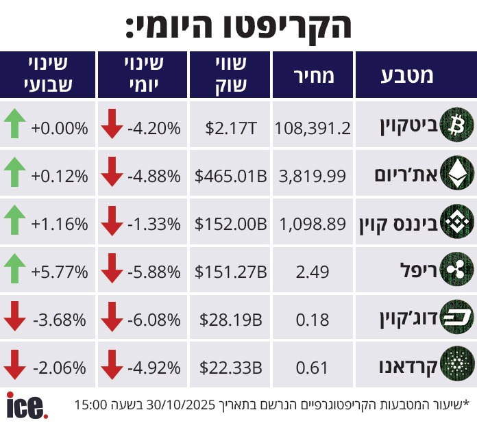 שוק מטבעות הקריפטו המשיך גם היום במגמת הצלילה של המטבעות, כאשר מי שירד בשיעור הגבוה ביותר הוא הדוג'קוין שירד ביותר מ-6%. בקרב המטבעות הגדולים, המטבע הבכיר ביותר הביטקוין ירד בשיעור של 4.20% לרמה של 108,391 אלף דולר ליחידה ועומד על שווי שוק של 2.17 טריליון דולר.