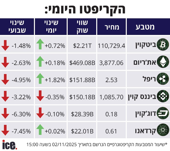 בקרב המטבעות הגדולים, הביטקוין כאמור עלה בשיעור של 0.72% לרמה של 110,729 דולר ליחידה ועומד על שווי שוק של 2.21 טריליון דולר. המטבע השני בגודלו האתריום עלה בשיעור של 0.18% לרמה של 3,877 דולר ליחידה ועומד על שווי שוק 469.08 מיליארד דולר. הריפל עלה בשיעור של 1.82% לרמה של 2.53 דולר ליחידה ועומד על שווי שוק של 151.88 מיליארד דולר.