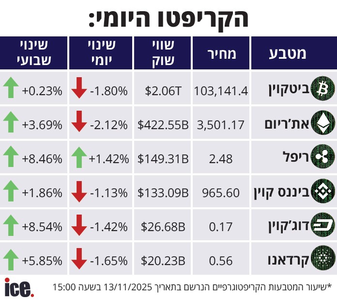 שוק מטבעות הקריפטו ממשיך במגמת הירידה מהימים האחרונים: הביטקוין צנח ב-1.80% ומחירו עומד על 103.141.4 דולר. האת'ריום השלים את הירידה הגדולה ביותר היום. ואיזה מטבע הוא היחיד שעלה?