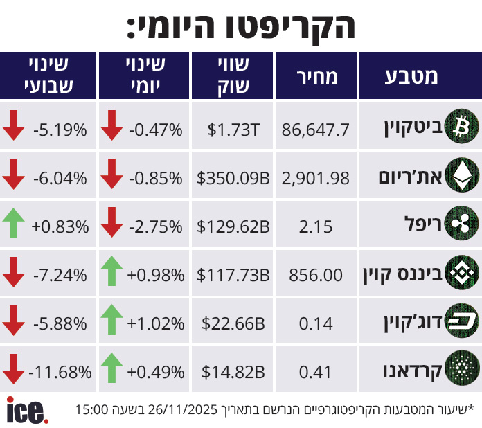 קריפטו יומי: לאחר יממה שבה חלה עלייה בכלל מטבעות הקריפטו, נרשמה היום ירידה בחלק מהמטבעות החזקים, הריפל שרשם את העלייה החדה ביותר ביממה שעברה, כעת המטבע - שחווה את הירידה הגדולה ביותר