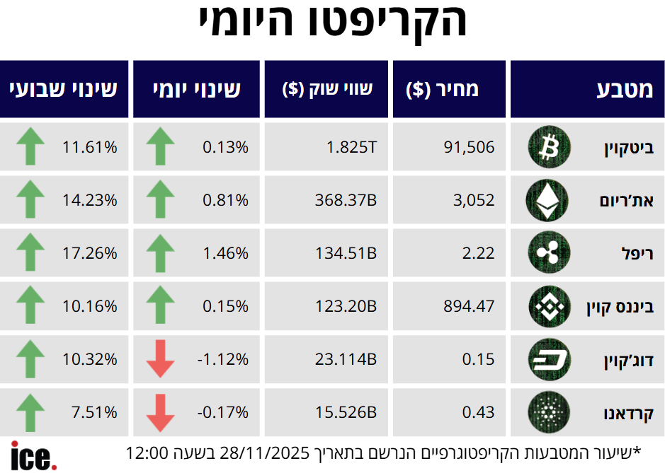 היום (שישי) שוק הקריפטו חווה תנופה נוספת כאשר נרשמת עלייה בקרב המטבעות המובילים. זאת לאחר תקופה אדומה, אשר בשיאה "מדד הפחד" הצביע על 10 - הנתון הנמוך ביותר במהלך השנה האחרונה, שכאמור משקף פאניקה בשוק. ביטקוין צומח ב-0.13% למחיר 91,506 דולר. שווי השוק של ביטקוין הינו 1.825 טריליון דולר.