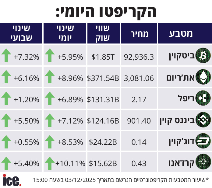 שוק מטבעות הקריפטו שחווה תנודות שליליות משמעותיות בשבועות האחרונים ממשיך את מגמת העלייה שלו מאתמול עם זינוקים של מטבעות בולטים רבים. הביטקוין רשם קפיצה של 5.95%. כעת מחירו עומד על 92.936.3 דולר, ושווי השוק שלו 1.85 טריליון דולר.