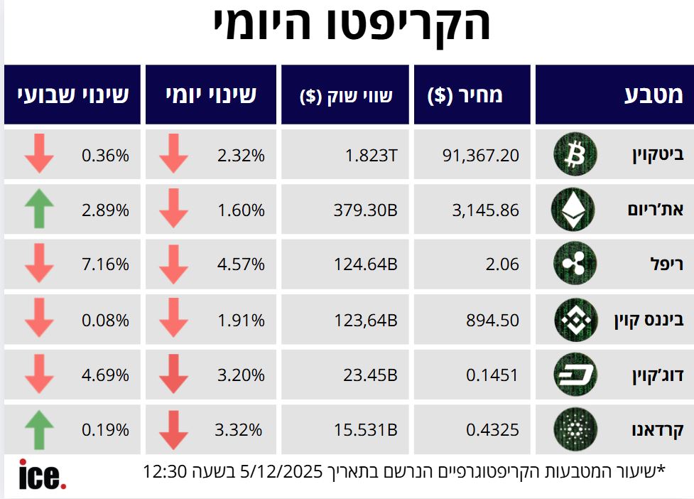 במסגרת המטבעות הגדולים המטבע היקר בעולם הלוא הוא הביטקוין, רושם ירידה 2.32% למחיר של 91,367.20 וכעת שווי השוק שלו עומד על 1.82 טריליון דולר.