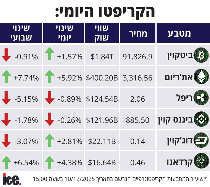 שוק הקריפטו חווה היום (רביעי) מגמה חיובית בעיקרה, זאת מלבד מטבעות הריפל והביננס קוין שהציגו שינויים שליליים. מטבע הביטקוין עלה ב-1.57%, הוא נסחר במחיר של 91,826.9 דולר ושווי השוק שלו עומד על 1.84 טריליון דולר. במהלך השבוע המטבע ירד ב-0.91%.